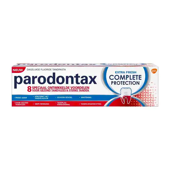 • Bij het gebruik van Parodontax Complete Protection Extra Fresh tandpasta wandelt u als het ware binnen in een volledig nieuwe wereld qua mondverzorging. De tandpasta is uiterst geschikt wanneer u tandvleesproblemen heeft. Parodontax is namelijk de ultieme kenner betreft het verzorgen van het tandvlees. Uw tandvlees zal meer rust en bescherming krijgen.